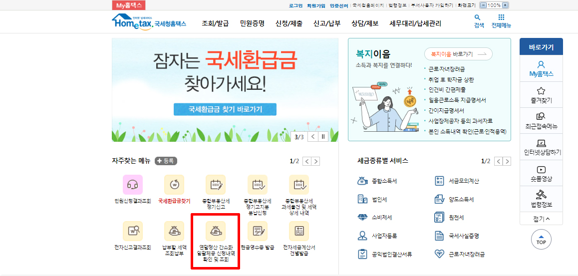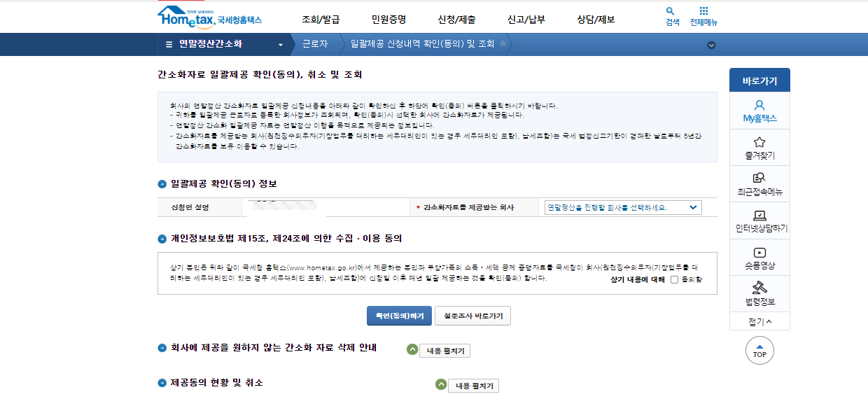 아래와 같이 국세청 홈페이지에 접속하신 뒤 연말정산 간소화 일괄제공 신청내역 확인 및 조회 버튼을 눌러서 진행하시면 됩니다.